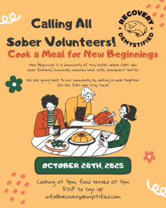 New Beginnings is a tiny house community that provides safe, permanent shelter to chronically unhoused people in south Fayetteville. We are gathering to cook a meal for them on Tuesday, October 28th! If you would like to contribute, send us an email at info@recoverydemystified.com to RSVP and we will let you know how to get involved.