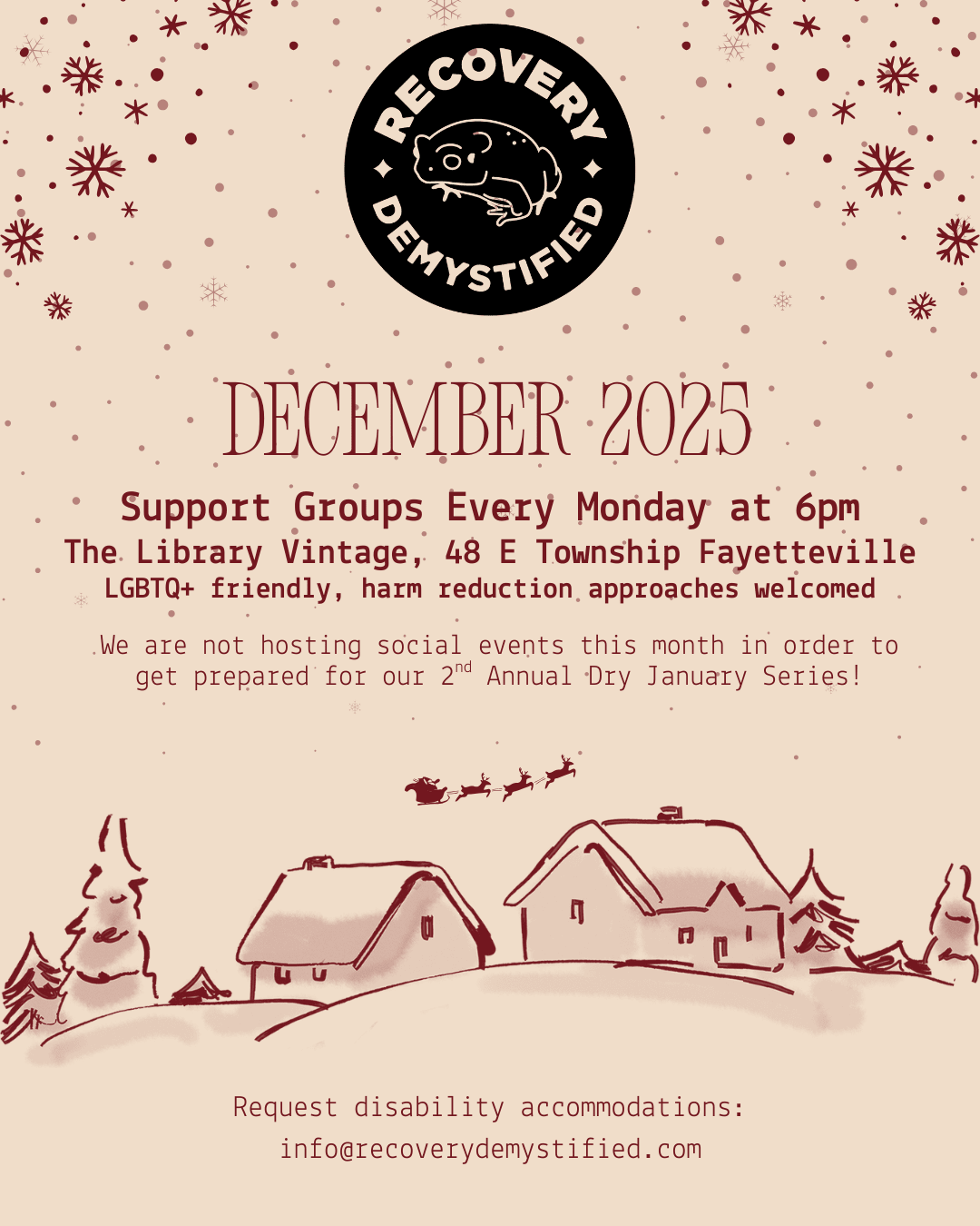 Support groups are still every Monday at 6pm at The Library Vintage in Fayetteville.
